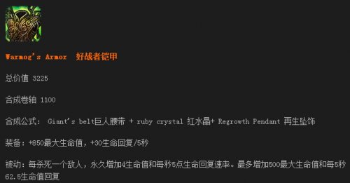 好战者铠甲:(购买路径:1防御-2生命恢复)