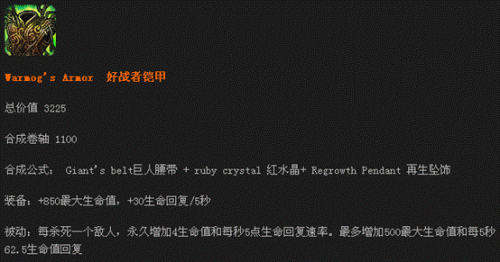 之后就优先出“好战者铠甲”。可以先买一个红水晶和再生坠饰做一下过度,有钱之后买一个巨人腰带,最终合成这个铠甲。本身这个物品的属性就很强力,+850的最大生命和被动特效使得“切加斯”在初期就是一个打不动的英雄。而且这个铠甲越早出越好,因为每杀死一个兵都会为自己增加生命上限,杀的兵越多,自己就越耐打对面就越郁闷。