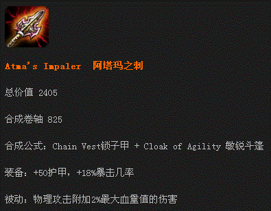 属于切加斯的逆天神器,物理攻击增加2%的最大血量值伤害,当我能合成这件装备的时候也有了近4000的血量,2%就是80的物理攻击 ,装备中除了无限之刃还有那件装备能加这么高的攻击力呢?在加上50的护甲,又可以让切加斯免物理伤害20%左右。