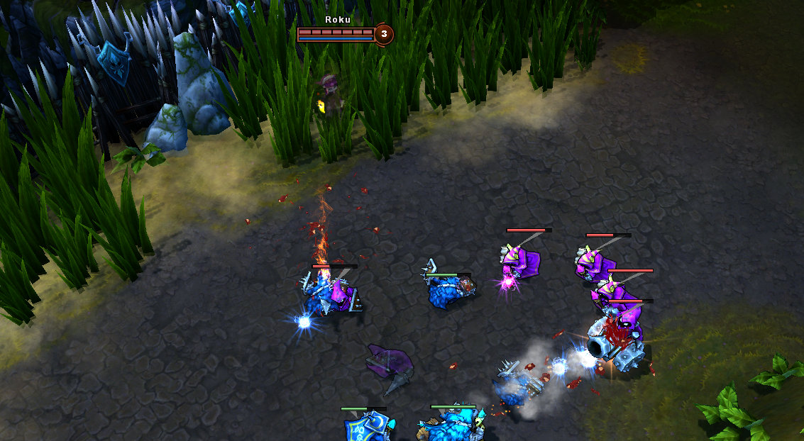 在没有杂兵协助的情况下攻击防御塔是不明智的,即使最强大的英雄也会受到防御塔巨大的伤害。在你向一座防御塔发起进攻前确保周围有一波杂兵或者一个友方英雄。