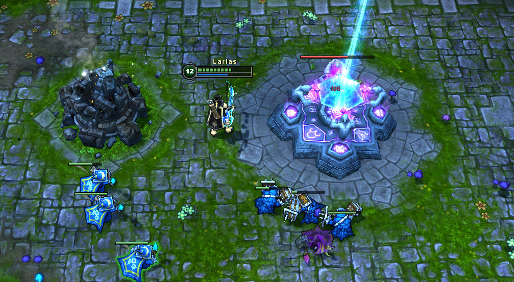 选择好英雄的初始技能和物品后,就该选择路线了。因为你是个新手,所以最好选一条有队友的路线。在敌人据点的深处,靠近他们的召唤者平台,坐落着他们的主基地,摧毁敌人的主基地会获得比赛的胜利。每条路上都间隔摆放着几座防守塔保护着主基地,你必须在路上一路推进直到主基地。毫无疑问,在每条路上你都会遇到对方的英雄和杂兵。主基地会刷新出一波电脑控制的杂兵帮助你攻击敌人的据点,杂兵相对较弱,所以对付敌方英雄时他们需要你的协助。