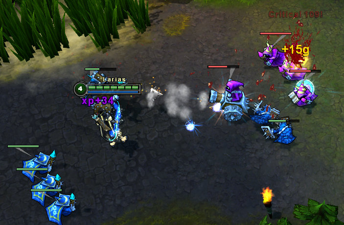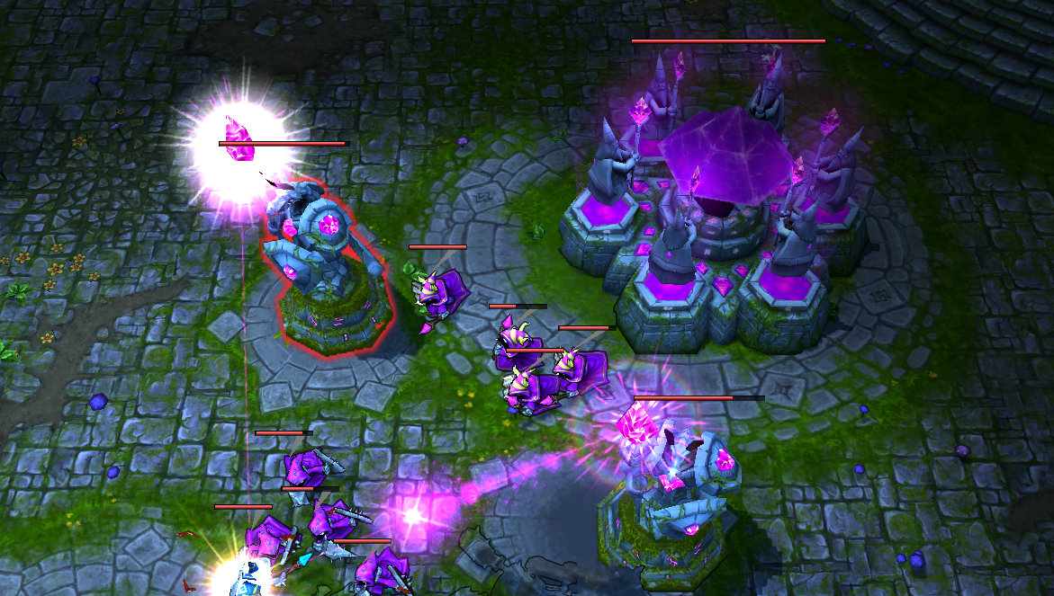除了敌人的杂兵和英雄,路上还有防御塔需要处理,防御塔会攻击附近的杂兵和英雄。当你尝试向敌人领土推进时,你必须摧毁这些防御塔使你的士兵们能够继续他们的进攻。在摧毁离你这边最近的防御塔之前杂兵们不会向前推进.