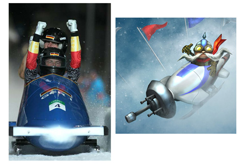 有舵雪橇是将雪车安装上金属舵板和制动闸制作而成,形如小舟又称作“雪地之舟”。在本届冬奥会上,德国队包揽了有舵雪橇男子双人赛冠亚军,显示出在这个项目上的强大实力。空军上将-卡奇在《英雄联盟》本来是驾驶飞机作战,为了配合冬奥会的开展,战舰也换成了有舵雪橇。