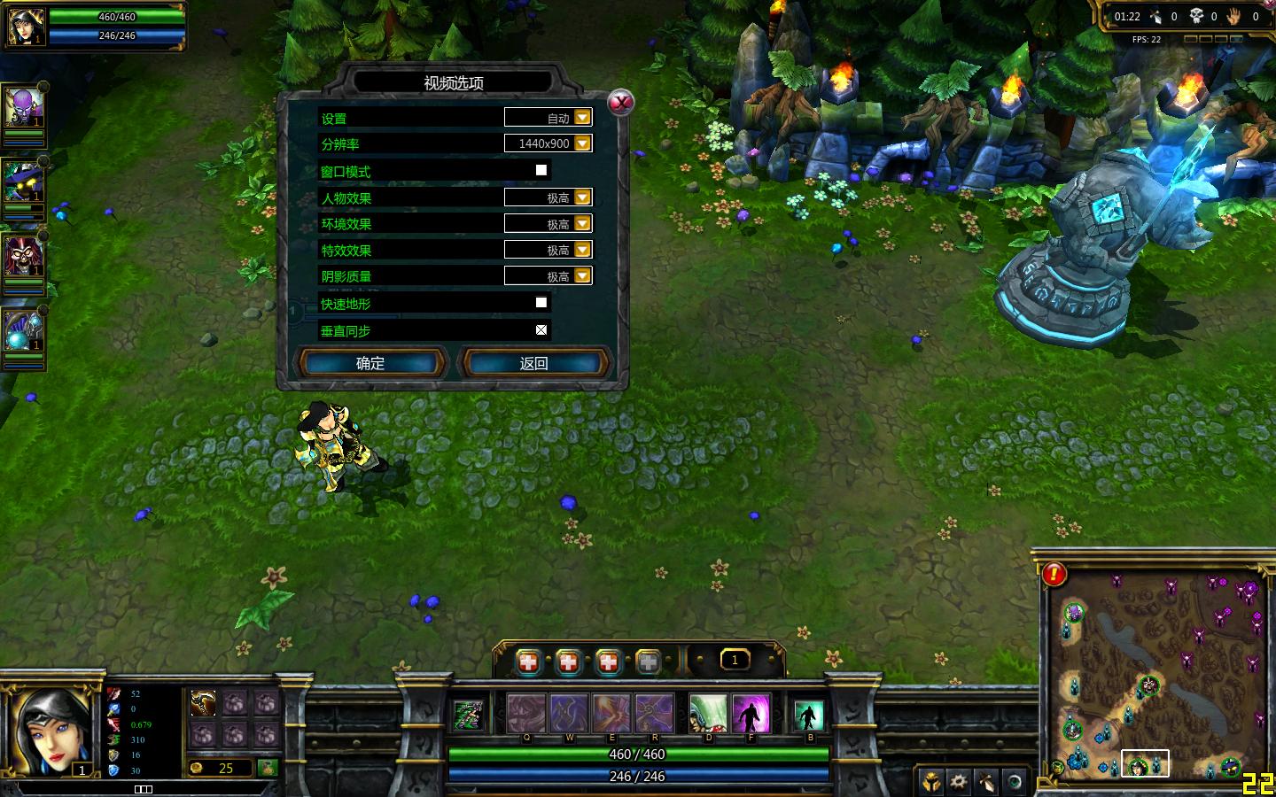 在分辨率1440x900下特效全开,帧数为22(图片右下角)有失帧现象,画面较卡。