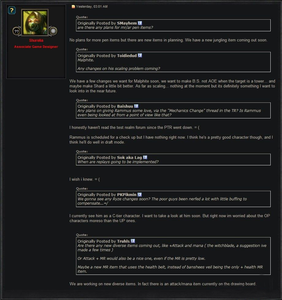 问:有没有任何增强Rammus的计划?就和测试服区的那篇“机理改动”帖一样?Rammus有像那个观点一样被考虑过么?