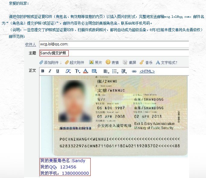 请把你的护照或签证复印件(有姓名、有效期等信息的内页)以插入图片的形式,完整地发送邮箱wcg.lol@qq.com,邮件名为“(角色名)提交护照(或签证)”,邮件内容务必注明您的美服角色名、联系QQ和手机号码。(说明:一旦您提交了护照或签证复印件、扫描件或数码照片,都将自动成为超级后备,8月3日前未提交者将失去晋级权)