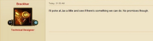 Brackhar说官方会注意一下贾克斯,看是否有可以改的东西,但不能保证一定会改。