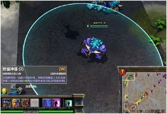 野蛮冲撞能把人撞很远,也能打断对方施法,而且释放范围比较大(如图)