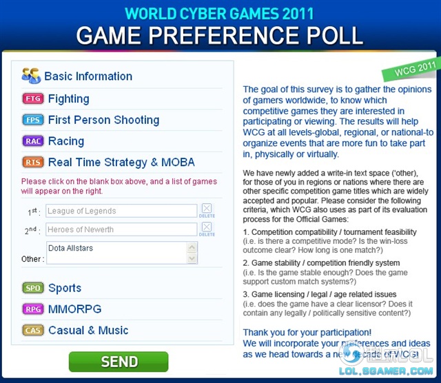 WCG2010世界总决赛的热度还未退去,WCG官方又开始了对WCG2011项目的投票,在投票页面的候选名单中,除了WAR3,CS,以及星际争霸等传统项目,我们还发现了星际争霸2,魔兽世界——大灾变,以及Dota类网游英雄联盟(LoL)与超神英雄(HoN)的名字。