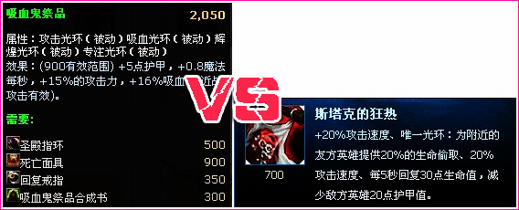 同属于光环类物品,吸血光环是亮点。吸血鬼祭品提供的回蓝效果能够保证英雄有足够的魔法释放技能,而斯塔克的狂热拥有强大的攻击速度加成以及范围回复和降甲,更是团战必不可少的装备。