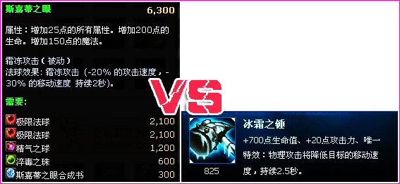 冰冻的效果人人都喜爱,普通攻击就可让敌人减速,斯嘉蒂之眼和冰霜之锤成为了强力的追杀神器。冰霜之锤虽然无法降低敌人的攻击速度,但是高生命的加成,成为脆皮英雄的不二之选。