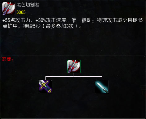 褐色切割者,这次版本更新之后,黑刀的属性有了重大变化,护甲削弱没变,降低了攻击但是加了30%的攻速(见下图)!有人说这是削弱了,我觉得这纯属扯淡啊!30%攻速是什么概念?每33秒多砍10刀,对于E,卡牌,女警这样的英雄不知道多了多少收益!削弱护甲再配合