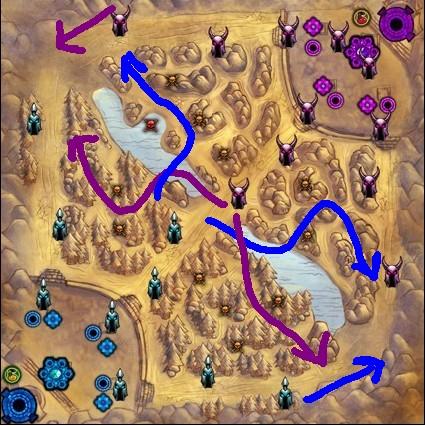 (顺风局中的眼位,集中于上路是因为蓝buff对双法师阵容的提升很大,此外可以频繁向中路与上路施压,并且靠近男爵,甚至可以放对方去下路打钱以此获得以多打少的机会)