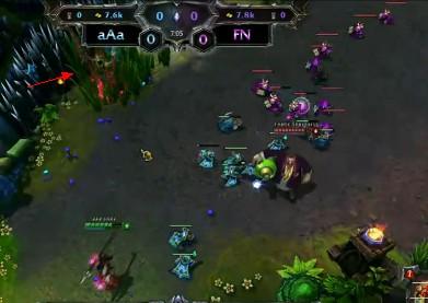 如图所示,紫方酒桶先推线,让蓝方失去对草丛的视野,紫方加文四世摸进草丛到达gank位置。后来发生的事情就是:紫方shushei的酒桶用大招将蓝方豹女炸到加文面前,合作完成了一次精妙的gank。