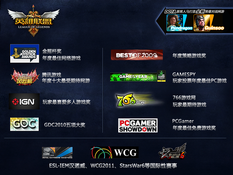 继去年获得“GAMESPY玩家投票年度最佳PC游戏”,IGN“玩家最喜爱多人游戏奖”、“年度策略游戏奖”、囊括GDC2010五项大奖、金摇杆奖“年度最佳网络游戏”之后,《英雄联盟》在2011年更是光辉不断,除了获得腾讯游戏“年度十大最受期待网游”、766游戏网“玩家最期待游戏”、PCGamer“年度最佳免费游戏奖”等多项殊荣之外,LOL还被受邀进军ESL-IEM汉诺威、StarsWar6、WCG2011等国际性赛事。LOL凭着游戏自身的高水准,迅速跻身为世界级竞技游戏。