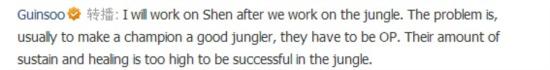 在野区改版之后我会着手开始做慎的改动。当前的问题是,如果把一个英雄打造成一个优秀的打野英雄,他们会在某些方面不平衡,因为打野的需要,他们的恢复能力和续航能力会变得过高。(也就是说Guinsoo的改动目标是把慎变成打野英雄,符合当前的欧式打法)