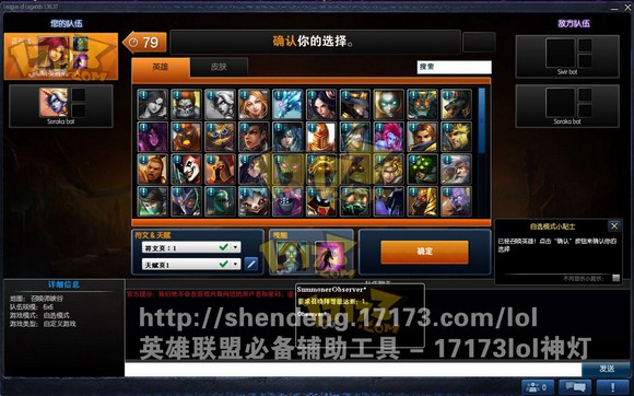 进入选英雄界面,由于是比赛的关系我们可以选择所有的英雄。看下图召唤师技能部分有一个新的召唤师技能(SummonerObserver*)选择此召唤师技能进入游戏。