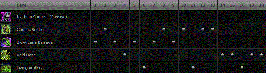 主动:克格'莫抛射出一团腐蚀性的唾沫,造成60/110/160/210/260(+0.7*法术强度)魔法伤害,并减少目标5/10/15/20/25的护甲和魔法抗性。