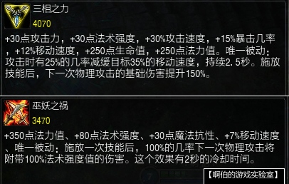 首先要进行实验的是三相之力与巫妖之祸之间的关系,大家请先看看它们的被动效果(图1)。