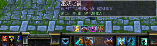 从图中可以看到在施放了一次技能之后所触发出来的效果是属于巫妖之祸的,由此可见巫妖之祸的判断是会优先于三相之力的。然后再来看看巫妖之祸与耀光同时装备之后的情况(图4)。