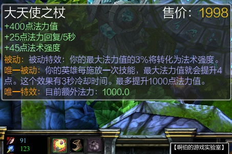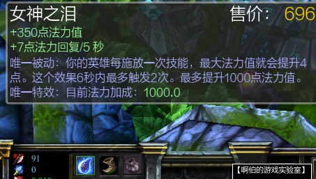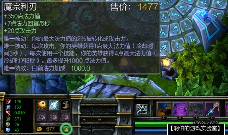 从图中可以看到刚合成出来的魔宗利刃写着的是“目前法力加成1000”,但仔细看看我的法力上限的话会发现只是增加了魔宗利刃本身带来的350点变成了2935,可见大天使与魔宗之间的特效是完全不叠加的(好吧,看到这句可能又有人会吐槽说“里头不是写着唯一特效吗,这样还要浪费时间来实验?”,关于这点我要说明的是我当然清楚是写着唯一特效,但问题是现在这个效果出现在两件不同的装备之中,这样的情况下你确定所有写着唯一的效果都不叠加吗?最简单的反面例子就是“明朗鞋”(减CD鞋)与“舒瑞亚的狂想曲”(皇冠),它们两个的减CD效果都是15%,并且两个都是写着“唯一被动”,但结果是它们之间的减CD效果是可以相互叠加的)