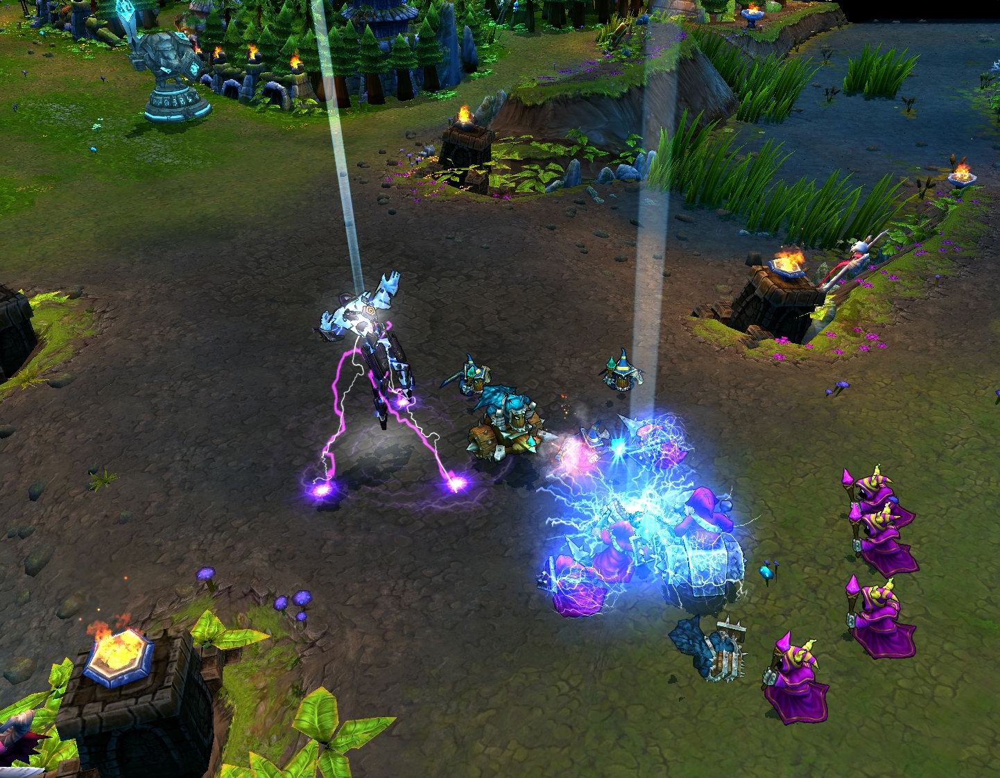 他开启W技能“能量聚集”之后的样子如下图所示,地上会有闪电与他联结,看起来非常的霸气。此外W技能暂时被设计为6-8秒的buff,这个技能的生效动画会比较久(0.75秒的样子),W的状态不是强制的,你可以关闭它并获得移动速度的加成。