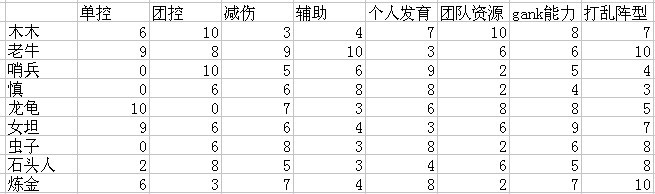 每个英雄都有一定的辅助、发育、gank能力,因此最低为3。而单控团控等技能没有就是没有,因此最低为0。团队资源,占用越多者得分越低。