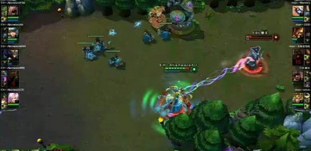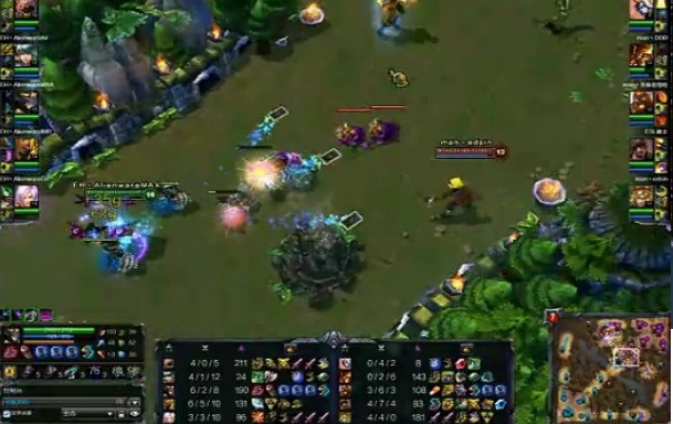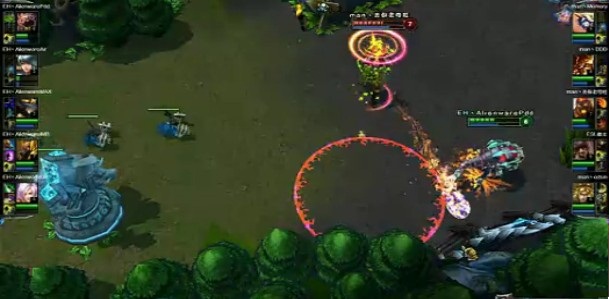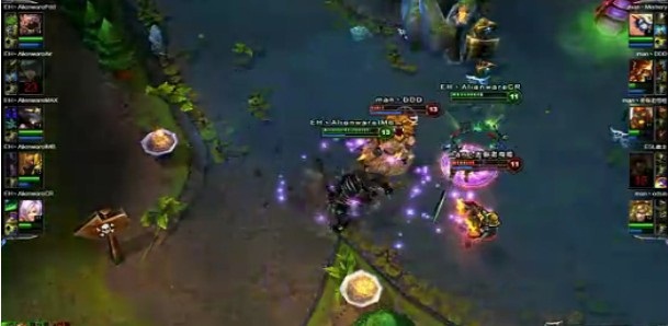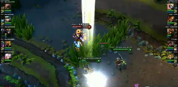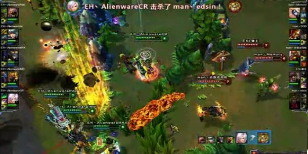 几分钟后Ehome也开始发威,先是瑞雯游走追杀中路的火人,卡牌也不吝惜大招第一时间传送过来晕住,火人挣扎了几下被瑞雯带走。