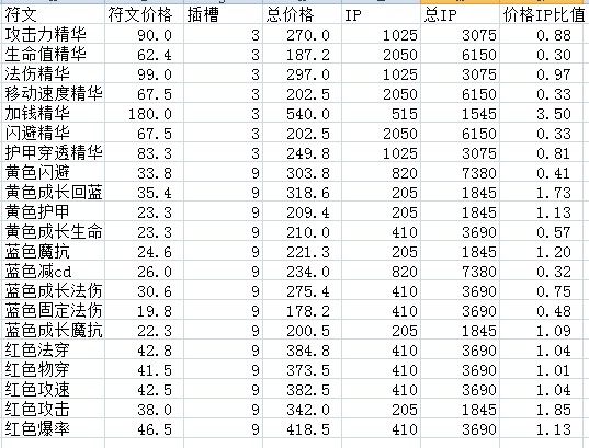 我还蛋疼的计算了哪些符文买起来比较物有所值,最后的结果是用游戏内属性价格与所花费IP的比值。