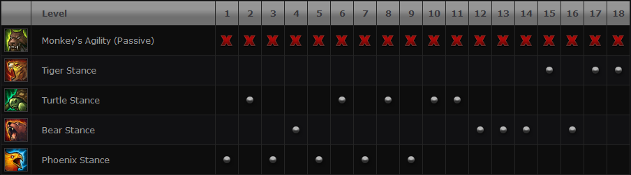 采用这样的技能加点顺序原因在于让特定技能的蓝耗能降低一些,这样你可以经常使用它们强大的效果。火凤姿态应最先满级,原因不言自明,它可以更加快速的清营,而且在团战和GANK中也能输出更高的伤害。把神龟姿态第二个满级,原因也很明显,因为它的作用是巨大的,你在游戏前中期可以有一个220+的保护罩来让乌迪尔几近无敌。巨熊姿态第三个满级因为后续等级并不会给你太多帮助,不明神龟姿态和火凤姿态那么明显。不过我倾向在把巨熊姿态满级之前先给猛虎姿态加个点,这样打起男爵或推起塔来就方便多了,而猛虎姿态的被动效果也可以用在火凤姿态里。