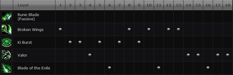这个技能保证了锐雯的存活,就算你叠了N把饮血剑依然如此。她的护盾是装备的AD加成,所以增加攻击力是一种双赢。我通常是用这个技能快速接近目标然后晕住他或者是快速逃跑。这个技能不能穿墙,同样能叠加被动。