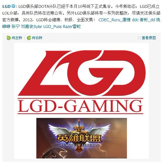 国服知名DOTA战队LGD近日在官方微博宣布将组建LOL分部,具体队员将在近期公布。