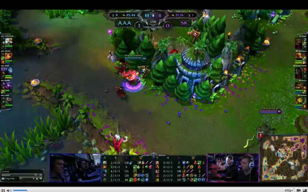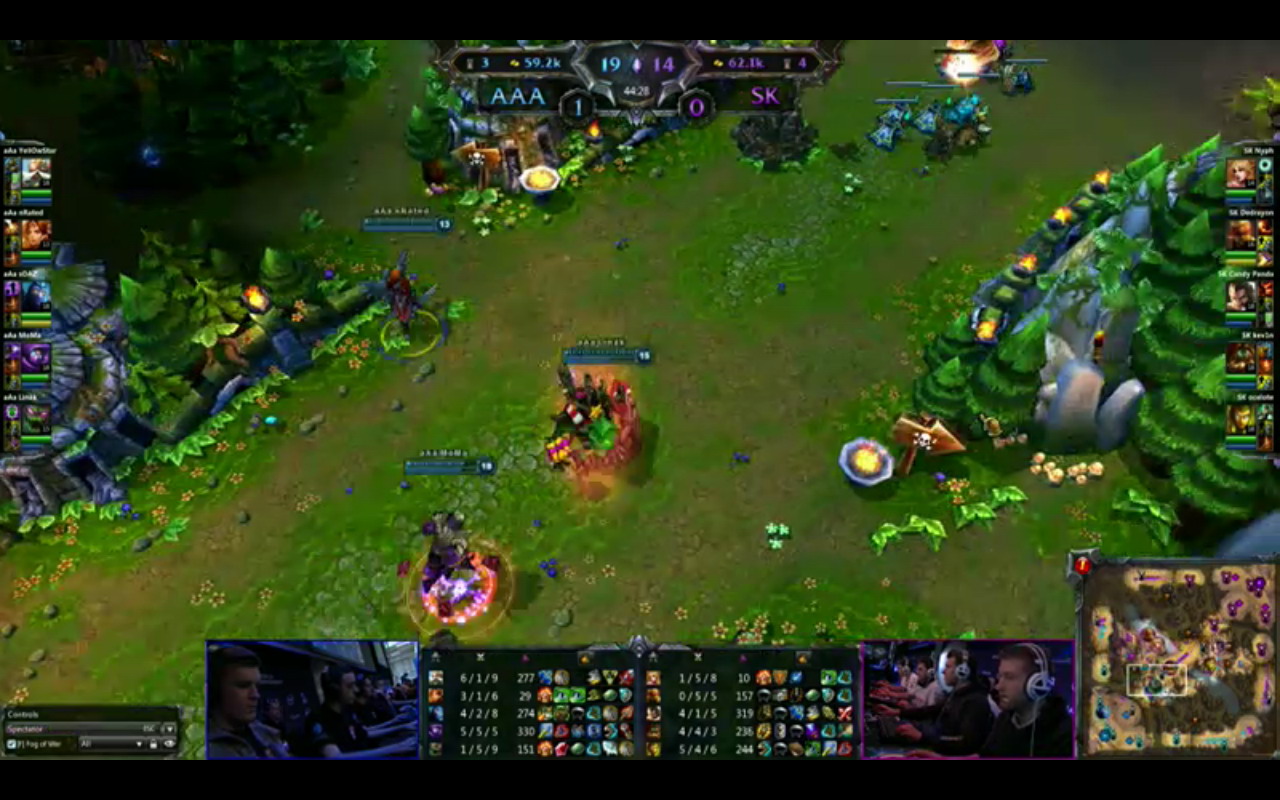 AAA飞机赶紧到sk蓝处抢蓝,结果最后一下给男枪拿掉,可惜。17分钟,中路会战,慎和先知杀掉乌迪尔和蛇女,然后aaa拿小龙,