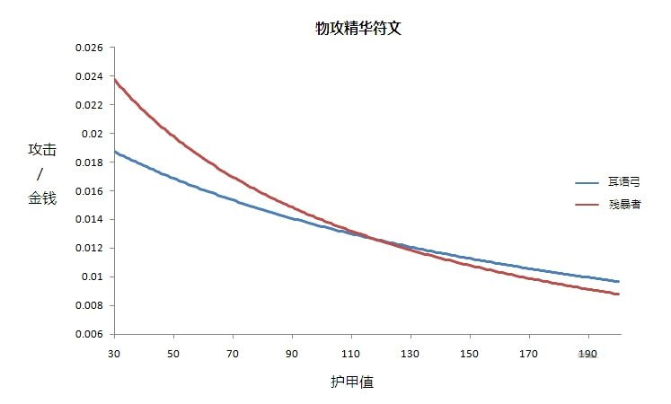 【耳语弓】和【残暴者】的伤害金钱比,红色符文和精华符文均使用物穿符文。