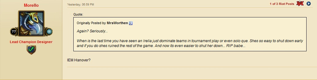 官方设计师Morello以刀锋意志在IEM汉诺威总决赛表现过于强势为由削弱了她。。