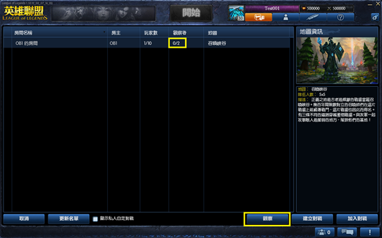 召唤师可以在自订对战的清单中找寻有开放观察者的房间加入,若该房间的主持人并未开启观察者系统,则会显示0/0 ,目前一场对战的观察者最高上限为两名;当然主持人也可以透过邀请来将好友请至自己的房间担任观察者。