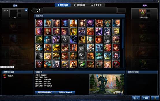 一旦房间主持人开始进行游戏,观察者也会跟着进入选角阶段,双方选择的英雄、禁用角色、使用的召唤师技能、玩家资讯都可以一览无遗,一旦双方都准备完毕,准备时间倒数至0 ,观察者就会看到画面右上角出现一个三分钟的延迟倒数,只要等到倒数完毕,观察者就会进入该游戏开始欣赏对战!