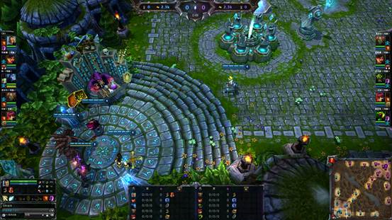 在观察者介面上方的是整体战况,召唤师可以在此看到游戏进行的时间、两只队伍分别击杀了多少英雄、拆了多少塔与整队的经济情形(1K代表1000金币),观察者能从这里很快的了解到双方的优势差距。
