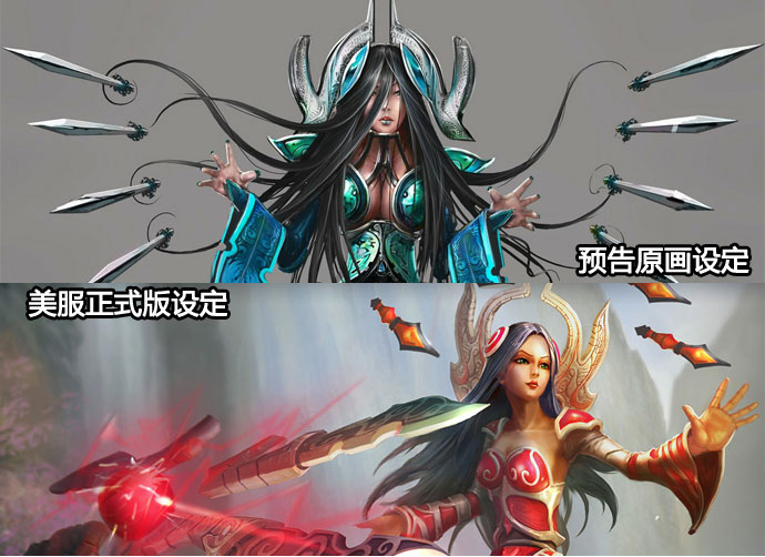 再透露一下刀锋意志的小故事,在游戏中的诸位女英雄中,刀锋意志是唯一一位在原画中被削弱的英雄,Riot在游戏杂志上初次放出她原画的时候,刀妹的胸部至少是G罩杯,新英雄上线之后乳量明显缩水,大家可以参照下面的图片来比对一下,惨绝人寰啊!连胸部的尺寸都可以nerf,还有谁比刀妹惨吗?或许她坎坷英雄生涯就是从这里正式开始的吧……
