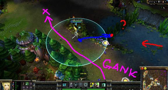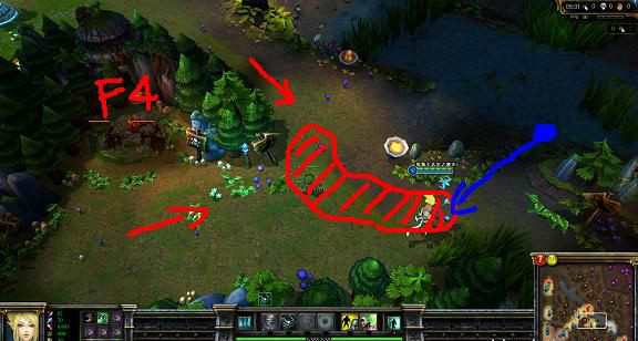 注意的是,因为辅助从小坡走上去是没视野的,本身前期又特别脆搞不好被人一套连带走,你可以选择在蓝色的位置直接插上去
