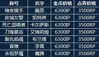 以下英雄版本更新后的售价为6300IP/3500RP: