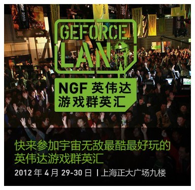第二届英伟达游戏群英汇(NGF2012/GeForce LAN)将于2012年4月29-30日在上海正大广场举行。秉承第一届英伟达游戏群英会的精髓,此次游戏盛宴仍然为期两天,将包含一系列最流行的电子竞技项目、最新的游戏体验、最强游戏硬件装备展示、炫目的3D立体幻镜体验、3D照相立体小剧场以及精彩的Cosplay表演, 让游戏玩家连续两天狂欢不停歇。