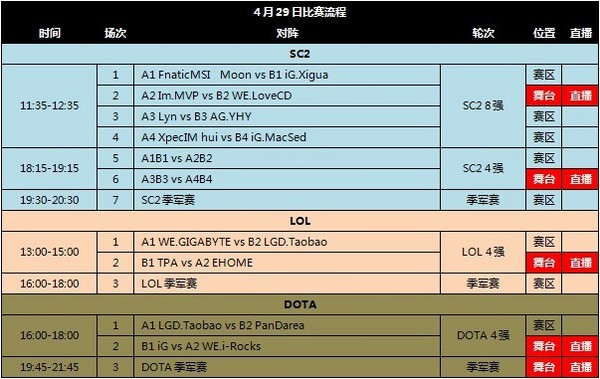 今天组委会公布了线下赛详细的比赛直播时间表: