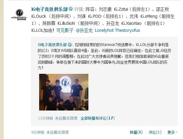 iG新的LOL阵容已经确定,在此之前,iG经历了历时2个月的调整期,在此对广大支持者说声抱歉,但我们相信崭新的iG会重新回到巅峰,争取在接下来的国际大赛中为国争光,向全世界展现中国LOL战队的实力!