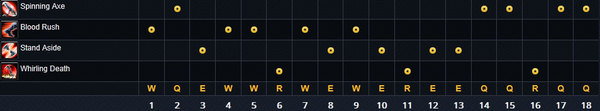 说明:德莱文获得额外的移动速度和攻击速度。额外的移动速度会在持续期间骤减。成功的接住一个旋斧会重置血冲的冷却时间。