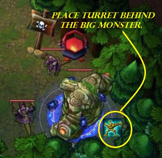 如果你想反制对方打野英雄,你可以躲在草丛中,等对方靠近就晕他然後放下炮塔就能轻松杀掉他