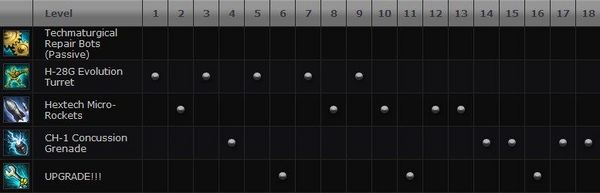 汉默丁格放置一座微型炮台攻击敌人。炮台拥有 (260 + 15 x 等级) 的生命值,每次攻击造成 30/38/46/54/62 (+0.2魔攻) 魔法伤害。每 25 秒储备一个炮台,最多储备 2 个。炮台型态随技能等级变化。