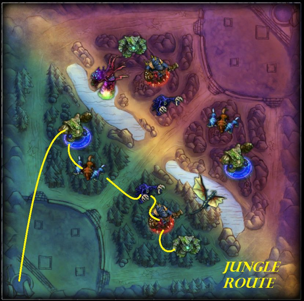 这是我们一般的打野路线,当你吃完一轮之後可以考虑去偷袭敌人或是入侵敌方野区,因为汉默丁格上4级之後在野区会变得非常强大,在此之前他只是还不错而已