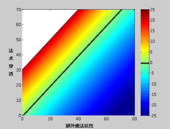 这两个属性可以看成矛与盾的关系,每一点法穿就能让你忽略目标一点魔抗。下面这个图可以清楚的展示出这两者的关系,我在计算时将攻击系的法穿天赋考虑在内了,目标的基础魔抗也是按照30点计算的,虽然会有误差,但是不会很大。