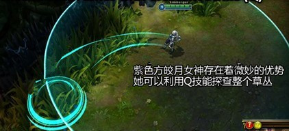 大家可以看到,紫色方的皎月女神的弧形释放轨迹在与上路的草丛很贴切,探测的范围几乎覆盖了整个草丛